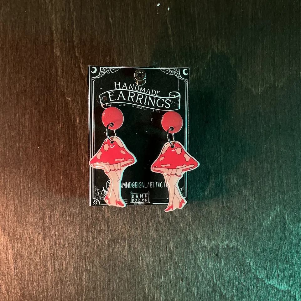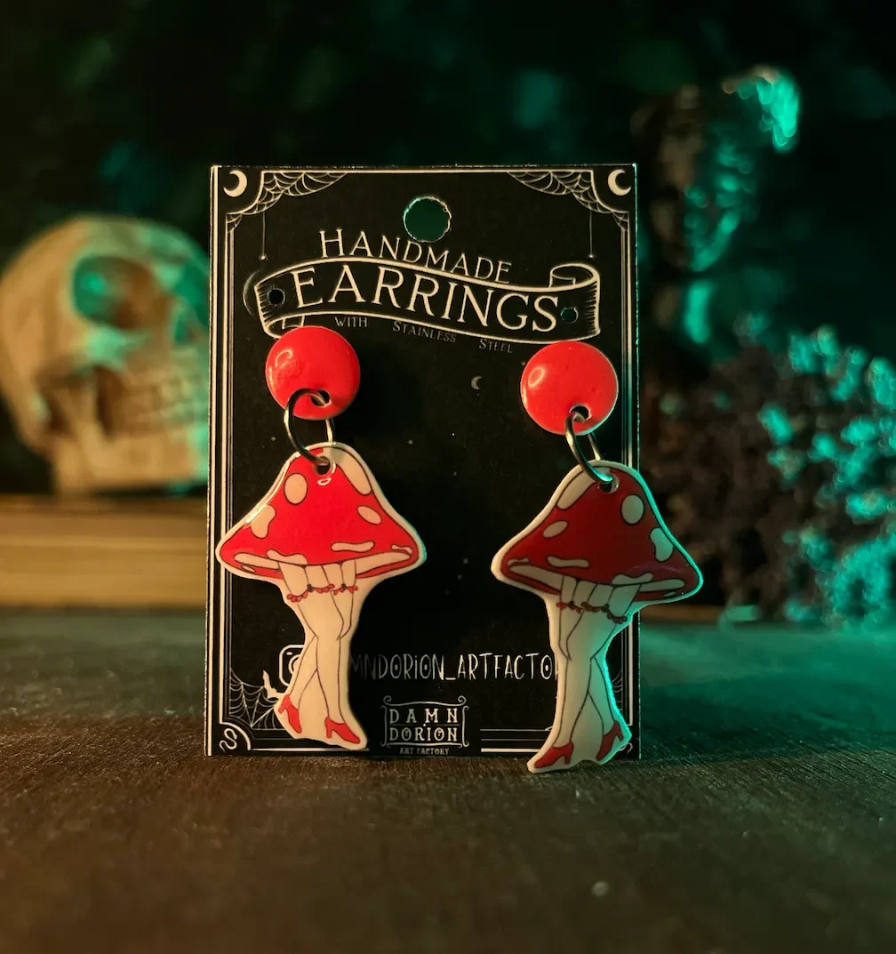 Ezek a kézzel készült piros lábas csini gombák alig várják, hogy új gazdájuk fülében díszeleghessenek. A mintás része a fülbevalónak egy speciális hőre zsugorodó fóliából készül, amire később gyanta réteg kerül, így biztosítva egy kis csillogást.