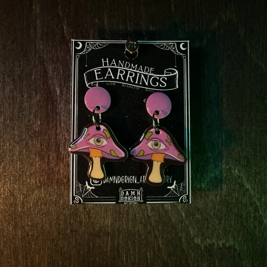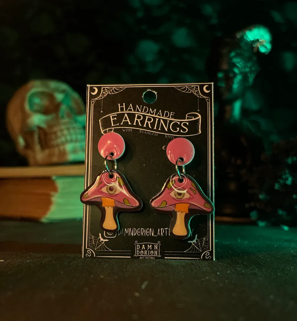 Ezek a kézzel készült gombás fülbevalók alig várják, hogy új gazdájuk fülében díszeleghessenek. A mintás része a fülbevalónak egy speciális hőre zsugorodó fóliából készül, amire később gyanta réteg kerül, így biztosítva egy kis csillogást.