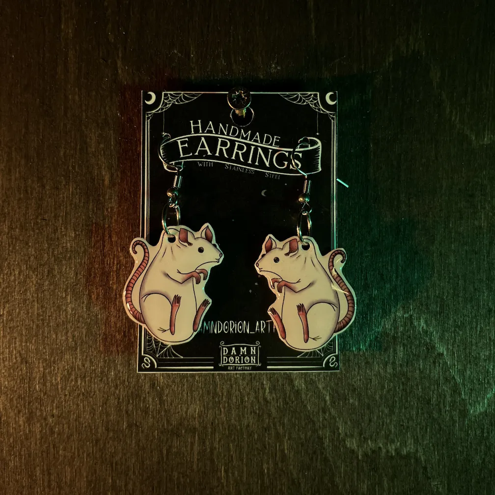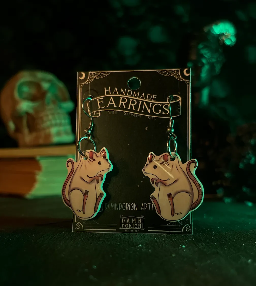 Ezek a kézzel készült patkányos fülik alig várják, hogy új gazdájuk fülében díszeleghessenek. A minta része a fülbevalónak egy speciális hőre zsugorodó fóliából készül, amire később gyanta réteg kerül, így biztosítva egy kis csillogást.