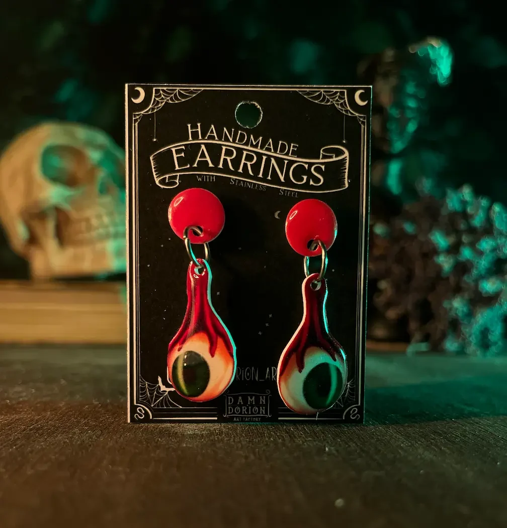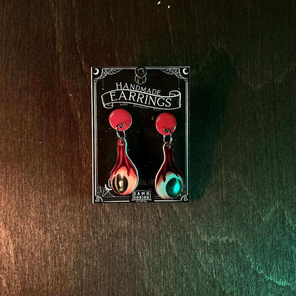 Ezek a kézzel készült szemek alig várják, hogy új gazdájuk fülében díszeleghessenek. A minta része a fülbevalónak egy speciális hőre zsugorodó fóliából készül, amire később gyanta réteg kerül, így biztosítva egy kis csillogást.