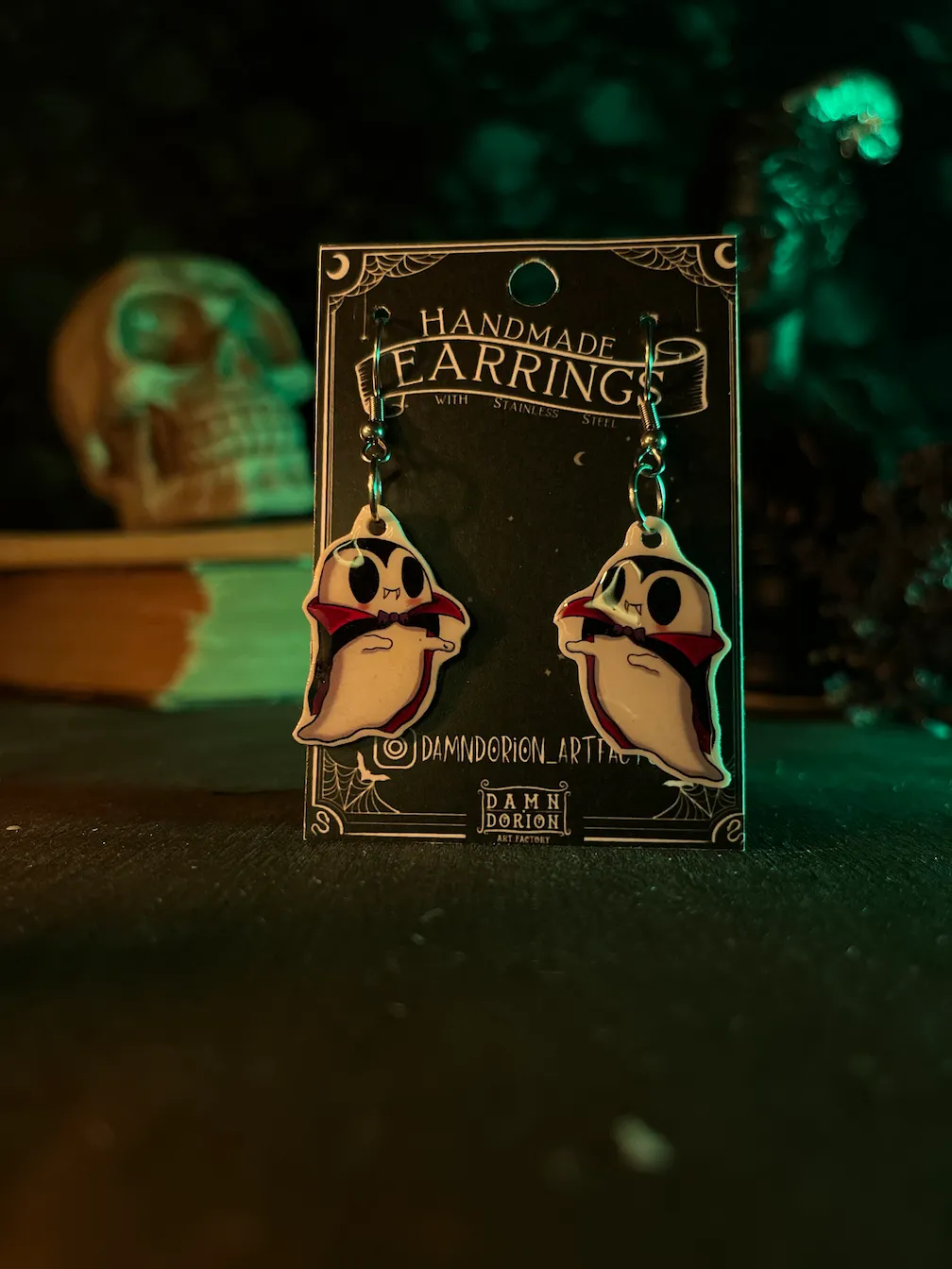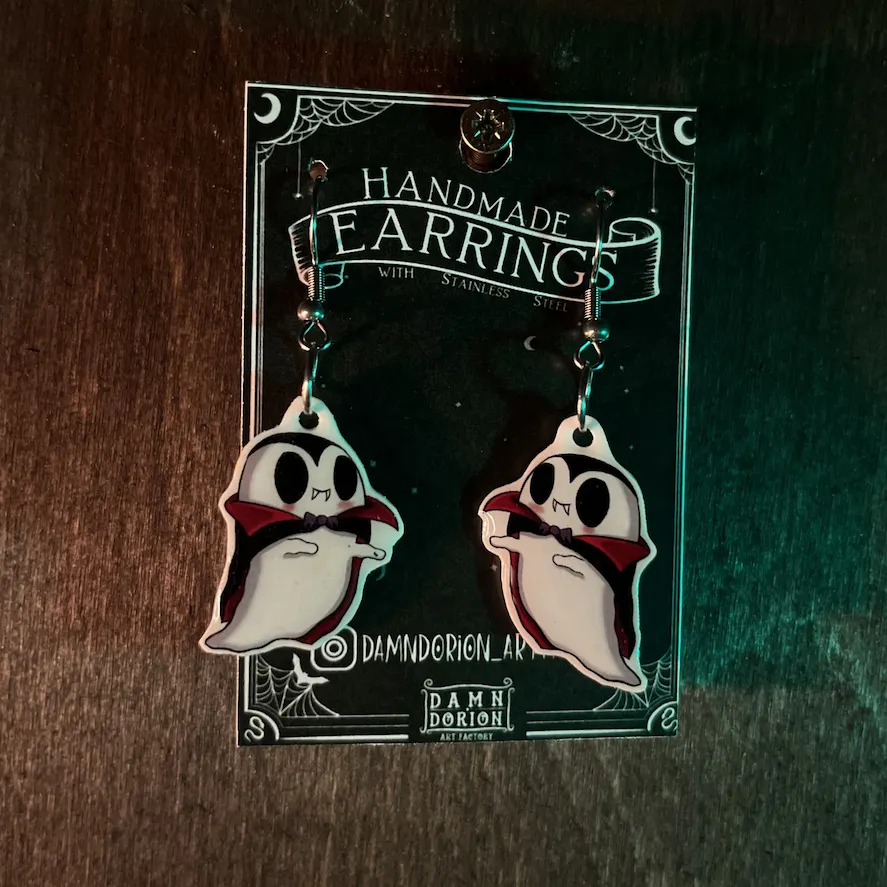 Ezek a kézzel készült vámpír szellem fülik alig várják, hogy új gazdájuk fülében díszeleghessenek. A minta része a fülbevalónak egy speciális hőre zsugorodó fóliából készül, amire később gyanta réteg kerül, így biztosítva egy kis csillogást.