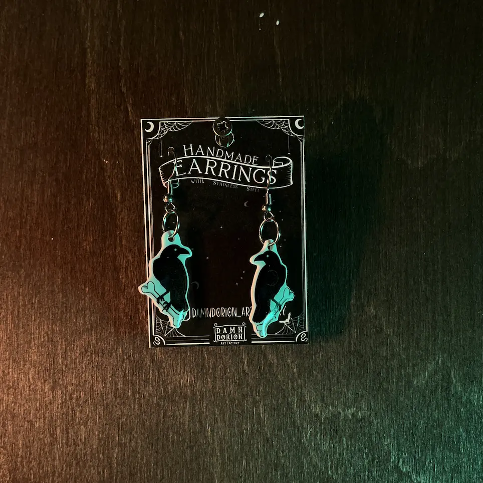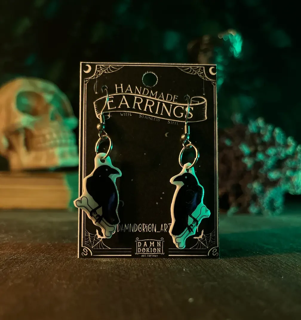 Ezek a kézzel készült varjú fülik alig várják, hogy új gazdájuk fülében díszeleghessenek. A medál része a fülbevalónak egy speciális hőre zsugorodó fóliából készül, amire később gyanta réteg kerül, így biztosítva egy kis csillogást.